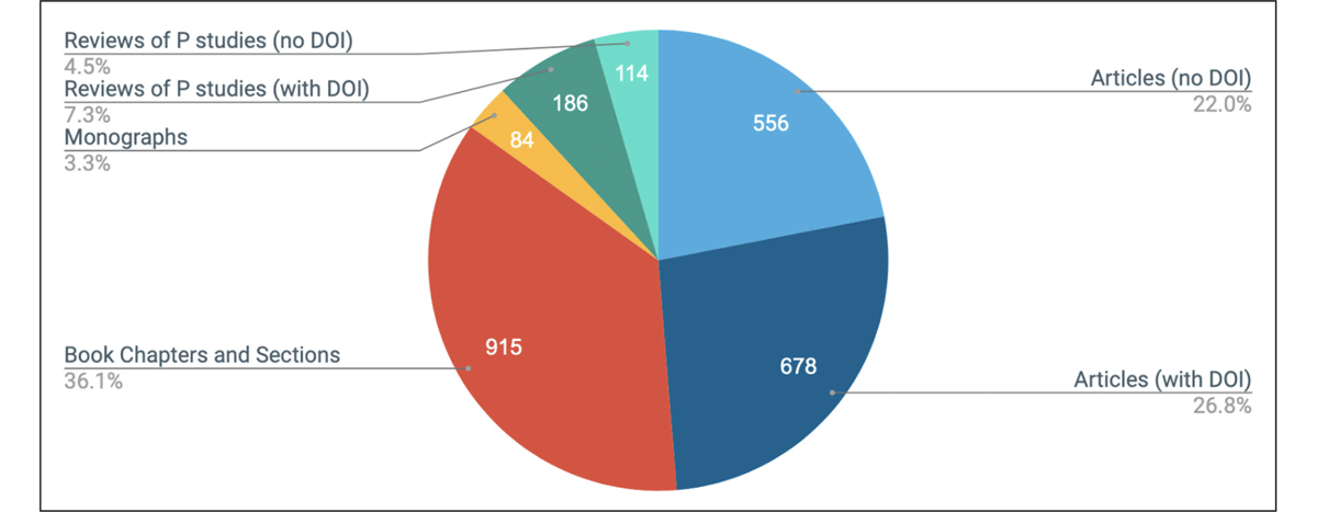 Figure 1 presents the counts of metadata on more or less “scholarly”3 contributions in TPOB: 84 monographs, 1,234 articles, 915 book chapters and sections, and 300 reviews of Pynchon studies, for a total of 2,533 Pynchon studies, total. Not visualised here, TPOB additionally contains metadata on 451 reviews of Pynchon’s texts from a mix of scholarly sources and news media, as well as 178 texts which Ryckx classified as “cultural journal” reviews and articles about Pynchon. As the 1.0 update of TPOB focused on the academic sources of Pynchon studies, I have not extensively reviewed or updated these media entries. While I have updated and expanded upon Ryckx’s initial classification scheme, no particular claims are drawn from the taxonomy followed; the main aim of TPOB 1.0 is simply to have as many resources in one place as possible, with as much useful metadata as possible, and taxonomies can be further developed in the future if they are useful.