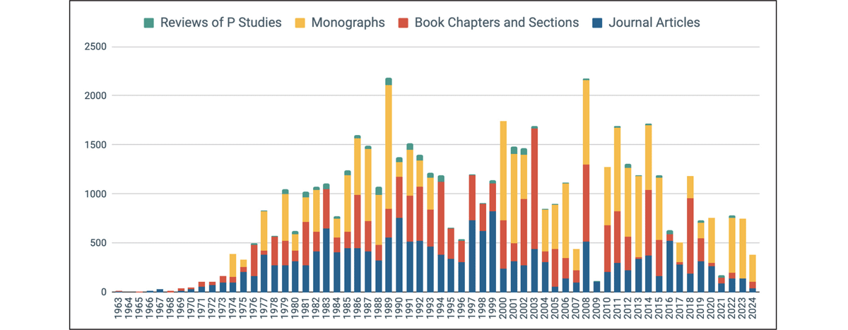 Figure 2 provides some evidence that the publications of new novels by Pynchon has invigorated scholarly output in the subsequent years; observe the renewed productivity form 1997 onward, following Mason & Dixon, then the years following 2009’s Inherent Vice. The declining pattern of publications in recent years is some evidence that the production of Pynchon studies in article and book chapter format has declined to low levels especially from 2021 on, although monographs remain a consistent source. Following the comprehensive summing up of Pynchon studies in three major edited volumes, Thomas Pynchon in Context (2018), Thomas Pynchon, Sex, and Gender (2018), and The New Pynchon Studies (2019), it may take more time for another major edited collection.