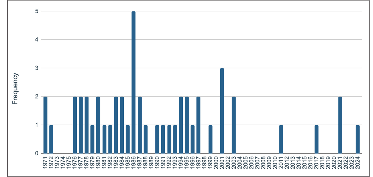 Examining the most frequent words in Pynchon studies titles with Pynchon’s name, surname, and book titles excluded (Table 2), the words present a familiar consensus summary of Pynchon’s texts: postmodern American fiction about history, paranoia, war, and science.9 The 51 instances of entropy reflect the abundance of focus in earlier Pynchon studies on the concepts/term; David Cowart wrote that “The most abused of these critical ‘keys’ to Pynchon is the concept of entropy” (1982, pg. 2), while Brian McHale summarized the “topoi of Pynchon criticism” as “entropy, Preterition, Manichaean dualities and excluded middles” (1990, pg. 139). TPOB allows us to gather evidence of such trends in Pynchon studies from titles alone (Figure 3).