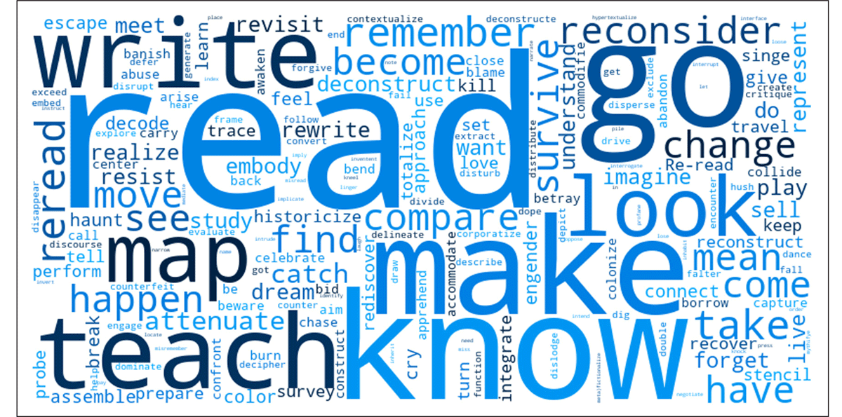 To dig into words in the titles further, I count 273 unique verb lemmas in the English language scholarly titles, from abandon to deconstruct to write.11 Verbs can provide evidence of not only the content of Pynchon studies but what actions these many Pynchon studies claim to be doing (Figure 4).