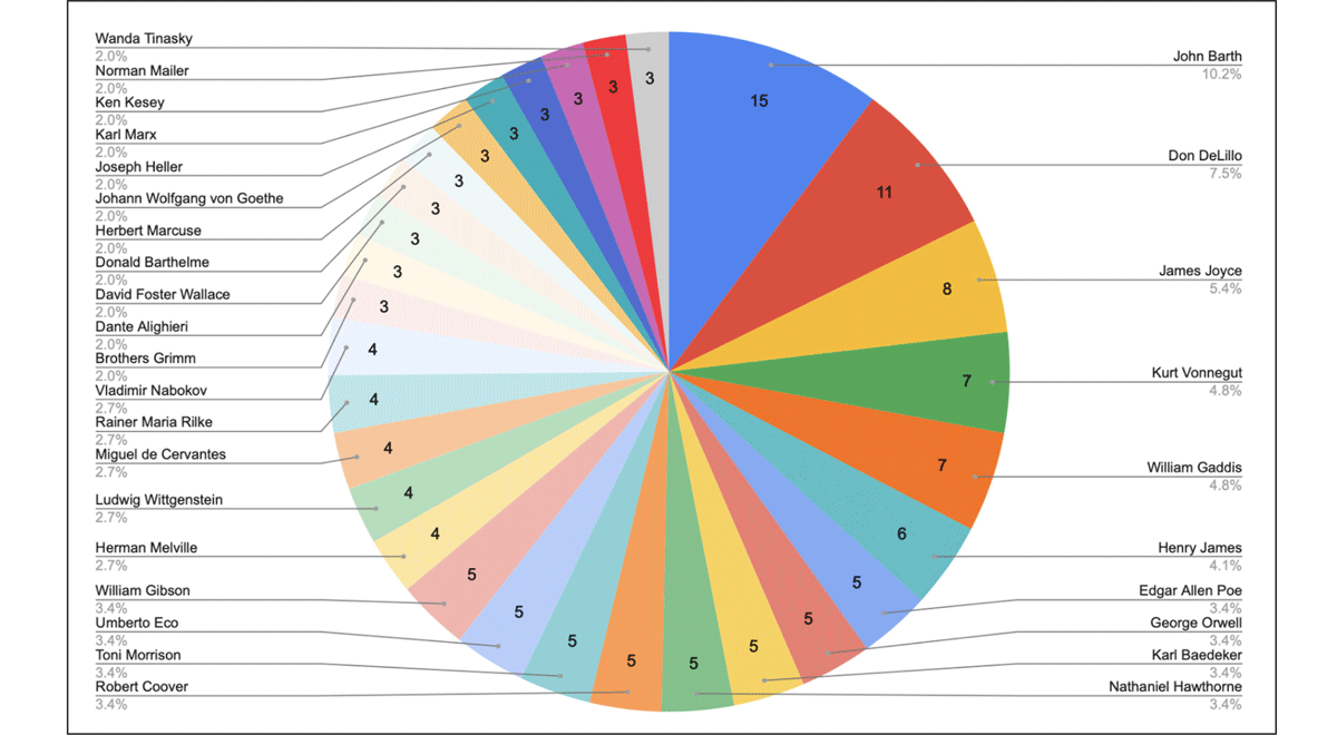 A modeling of text-to-commentary ratios in fiction inevitably implicates the notion of the canon, a vigorously contested discourse. As summarized by Jaume Aurell, “From the 1970s onwards, postmodern, postcolonial and feminist criticism has reactivated the disapproval of the canon. Its academic and pedagogical usefulness remains challenged by historians who have generally been skeptical of its critical worth, its role as an instrument of hierarchization and standard of quality” (2022). Could wider calculation of text-to-commentary ratios — of Pynchon and others — challenge any assumptions around canonicity? It is, at least, possible that new data may spark new conversations.